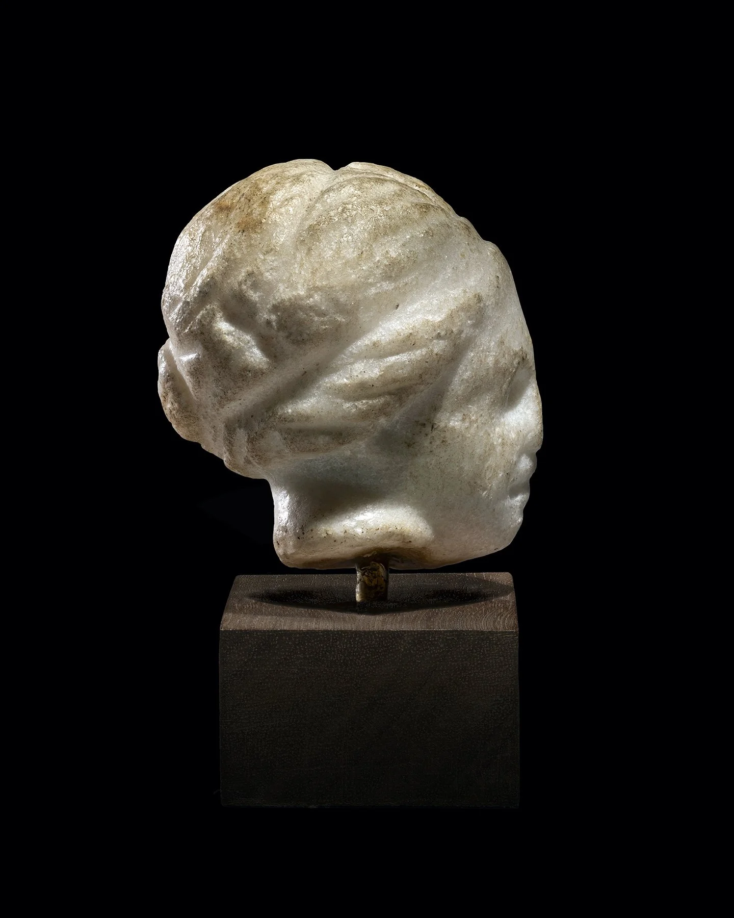 Likely depicting a goddess, her smooth oval face with deeply set eyes, and slightly open lips, her hair centrally-parted with a diadem, and a chignon at neck.