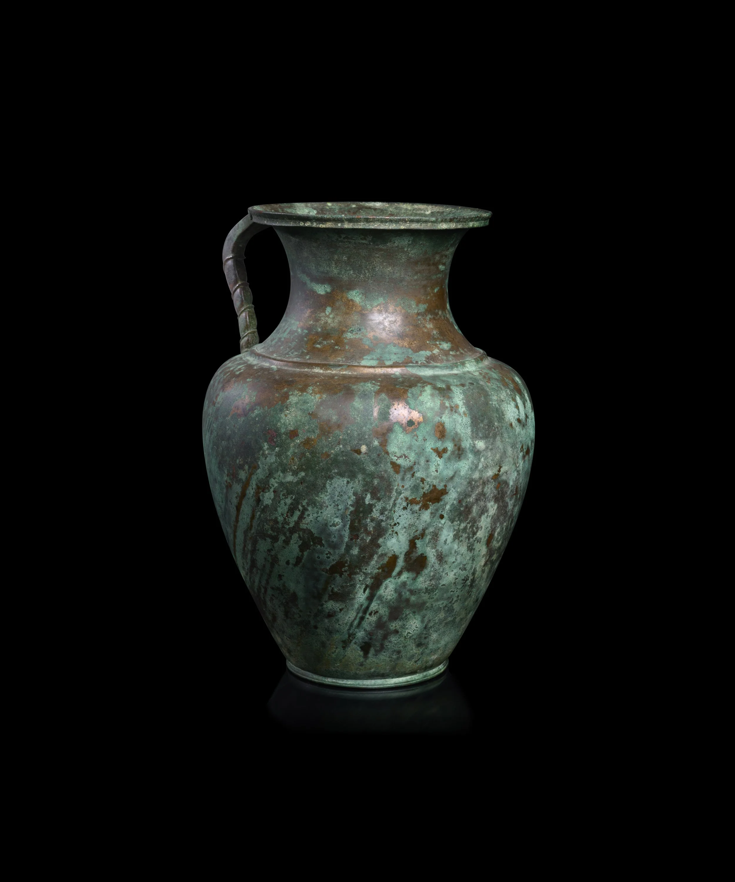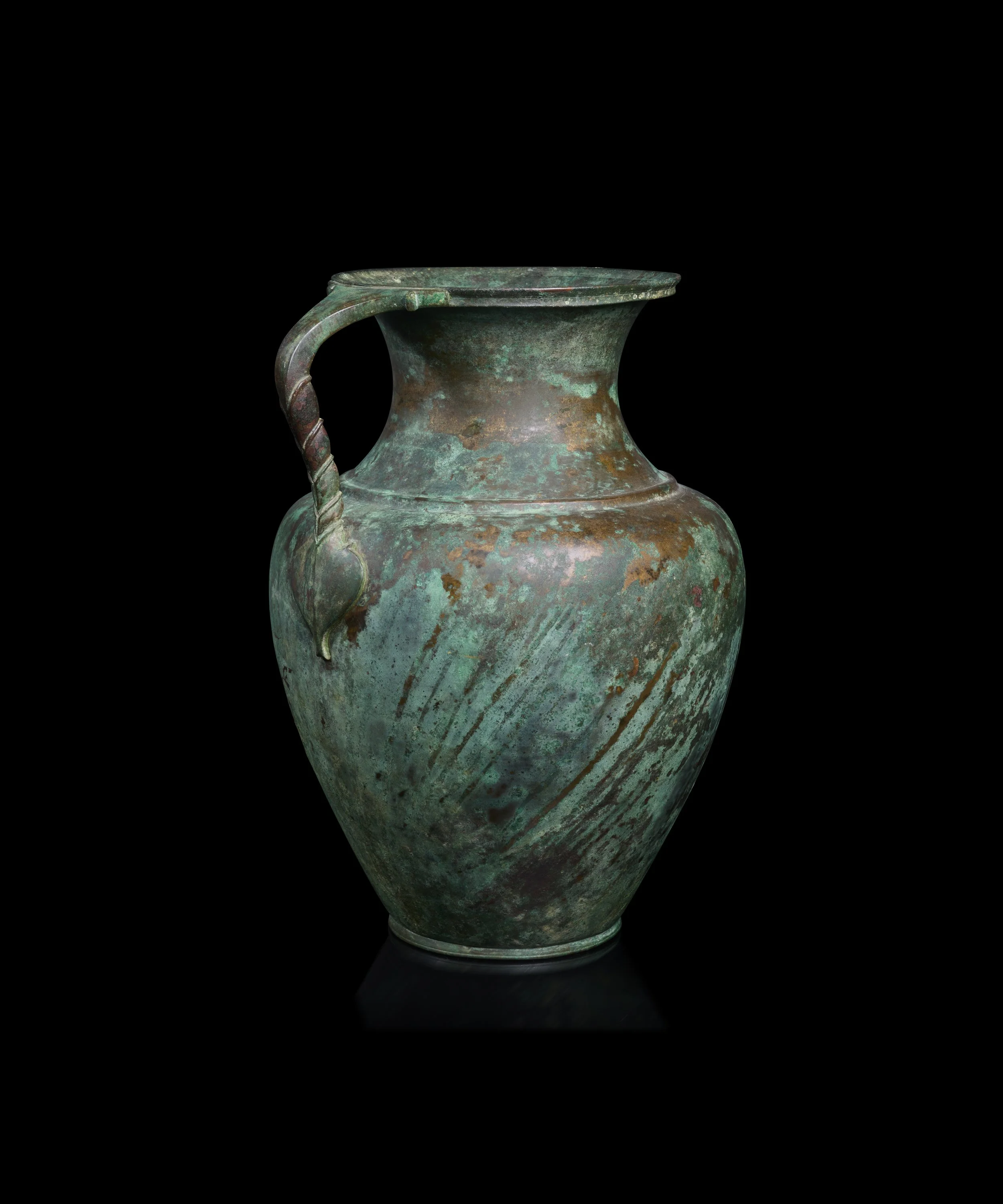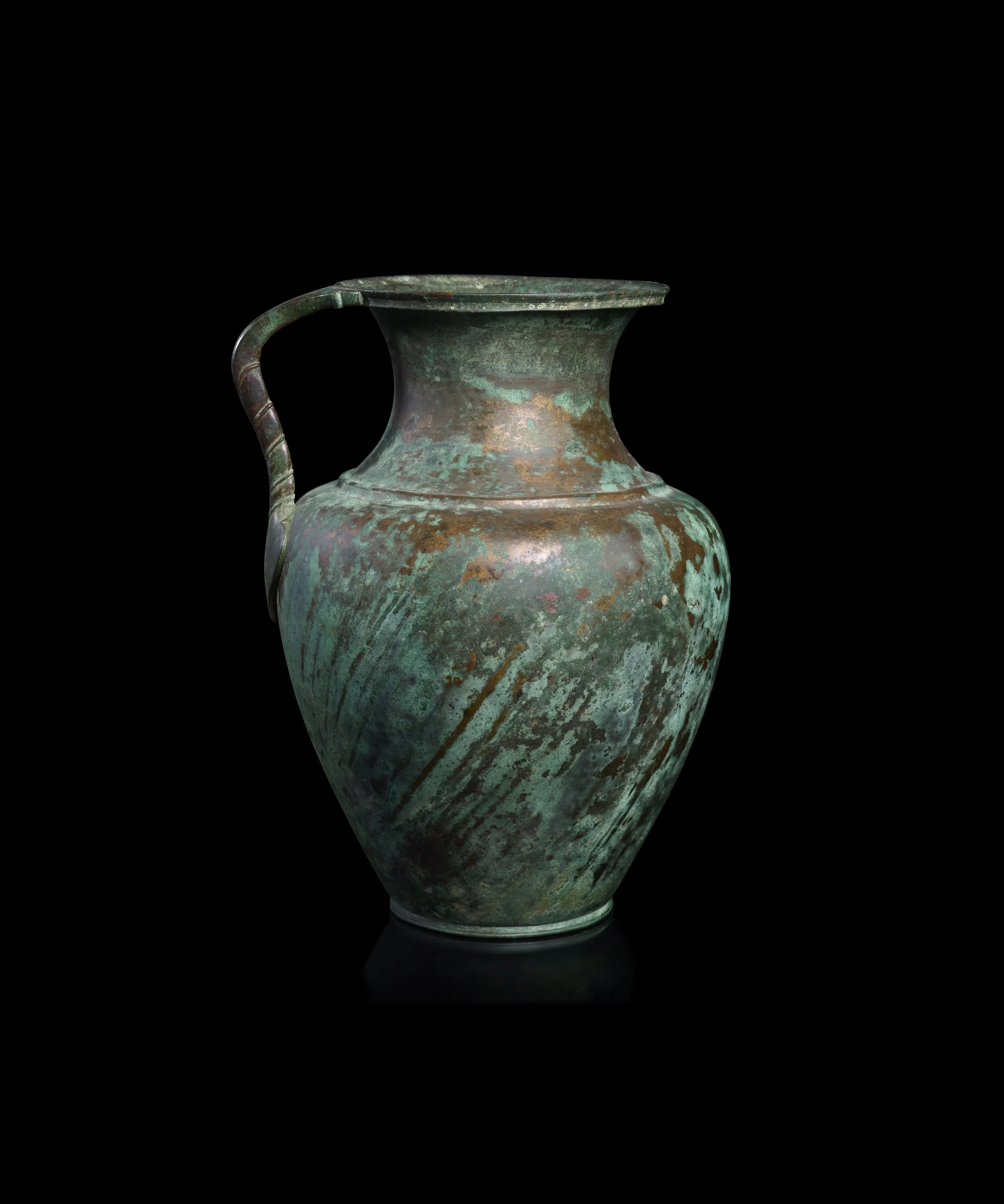Bronze jugs such as this example were popular throughout the Greek and Roman worlds. They were designed for tableware use, particularly for carrying and serving water and wine at banquets. Bronze vessels of this quality were regarded as highly luxurious objects, owned by only the wealthiest in society. Bronze vessels from this period show first-rate craftsmanship, and demonstrate mastery of symmetry and proportion.