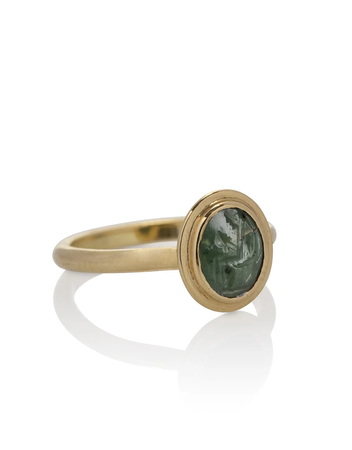 The ancient Roman chromium chalcedony gem engraved with a profile seated figure of an actor wearing a himation and holding a theatre mask out in front, set in a modern 18-carat gold ring.