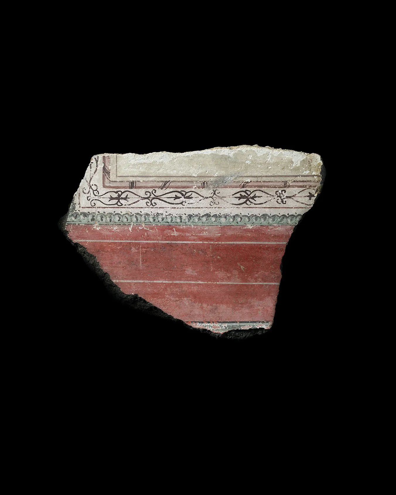 The fragment is painted with pigment on plaster, preserving the edge of a cream coloured border frame featuring scrolling tendrils in umber, with pink border above and a border of ovolo in green below. With on a red ground below, and the remnants of a border in green at the edge. With an old blue velvet mount, accompanied by a 19th / early 20th century label reading “Fresco wall painting. BC 200. From forum in Rome, discovered 1879…”