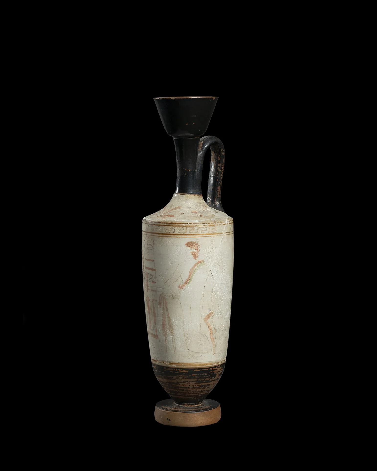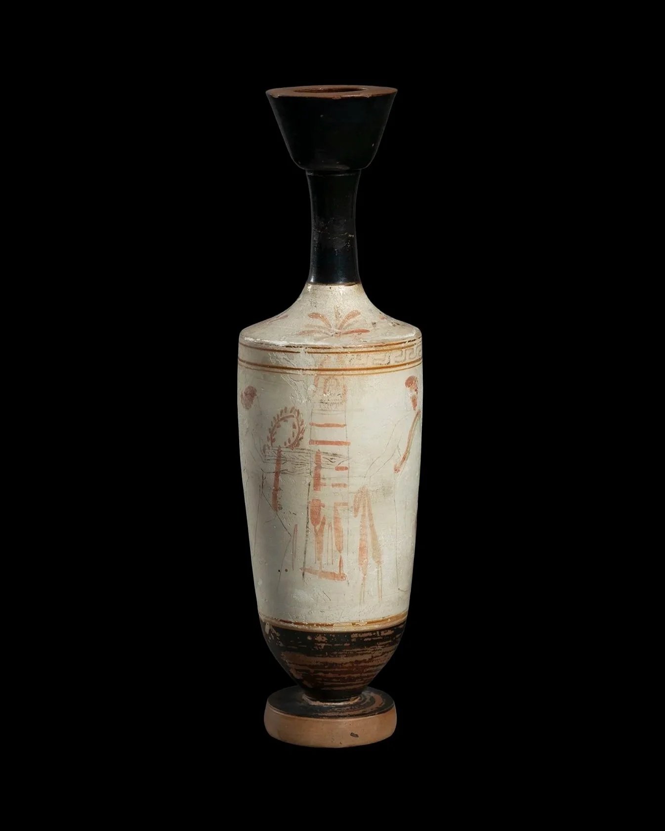 This type of lekythos, which prominently features the white-ground technique—a process involving the application of a kaolinite slip—is believed to have been used in funerary processions. Resplendent in its white finish, oil jars of this type often depict funerary themes, such as this example, where figures bring offerings to a grave stele. Attributed to the 'Woman Painter,' aptly named for their striking depictions of women, close comparisons can be drawn to other vases in Kurtz’s extensive study of the type. Another close example is housed in the Metropolitan Museum of Art (Acc. 06.1169).